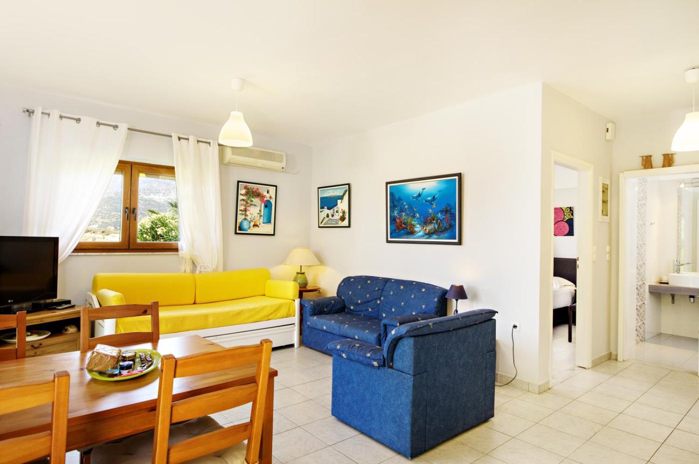 One-Bedroom Apartment. Boasting a private entrance, this air-conditioned apartment features 1 living room, 1 separate bedroom and 1 bathroom with a walk-in shower and a hairdryer. Meals can be prepared in the kitchen, which has a stovetop, a refrigerator, kitchenware and an oven. The apartment features a coffee machine, a seating area, a dining area, a flat-screen TV with satellite channels, as well as sea views. The unit has 3 beds.